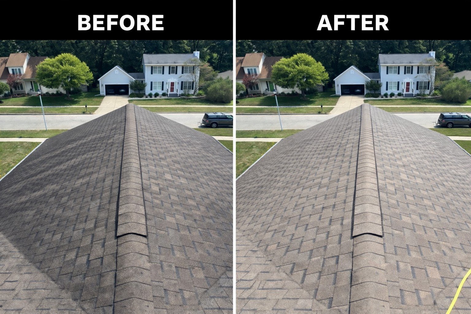 Unlike high-pressure washing — which can strip granules and cause costly damage — our soft wash method cleans your roof the right way.